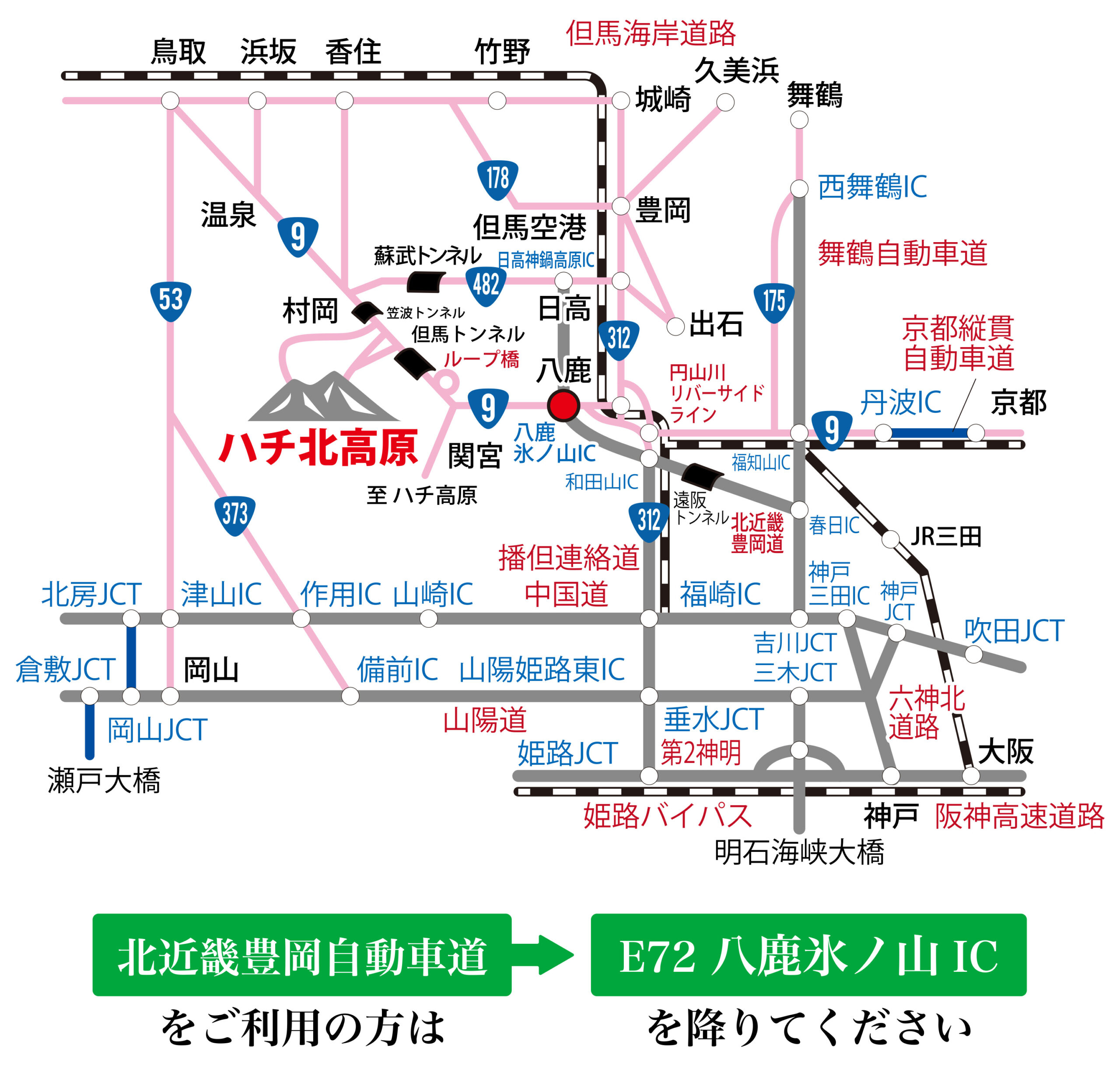 途中、「木の殿堂」「但馬高原植物園」を通過、「ゲレンデ駐車場」までお越し下さい。