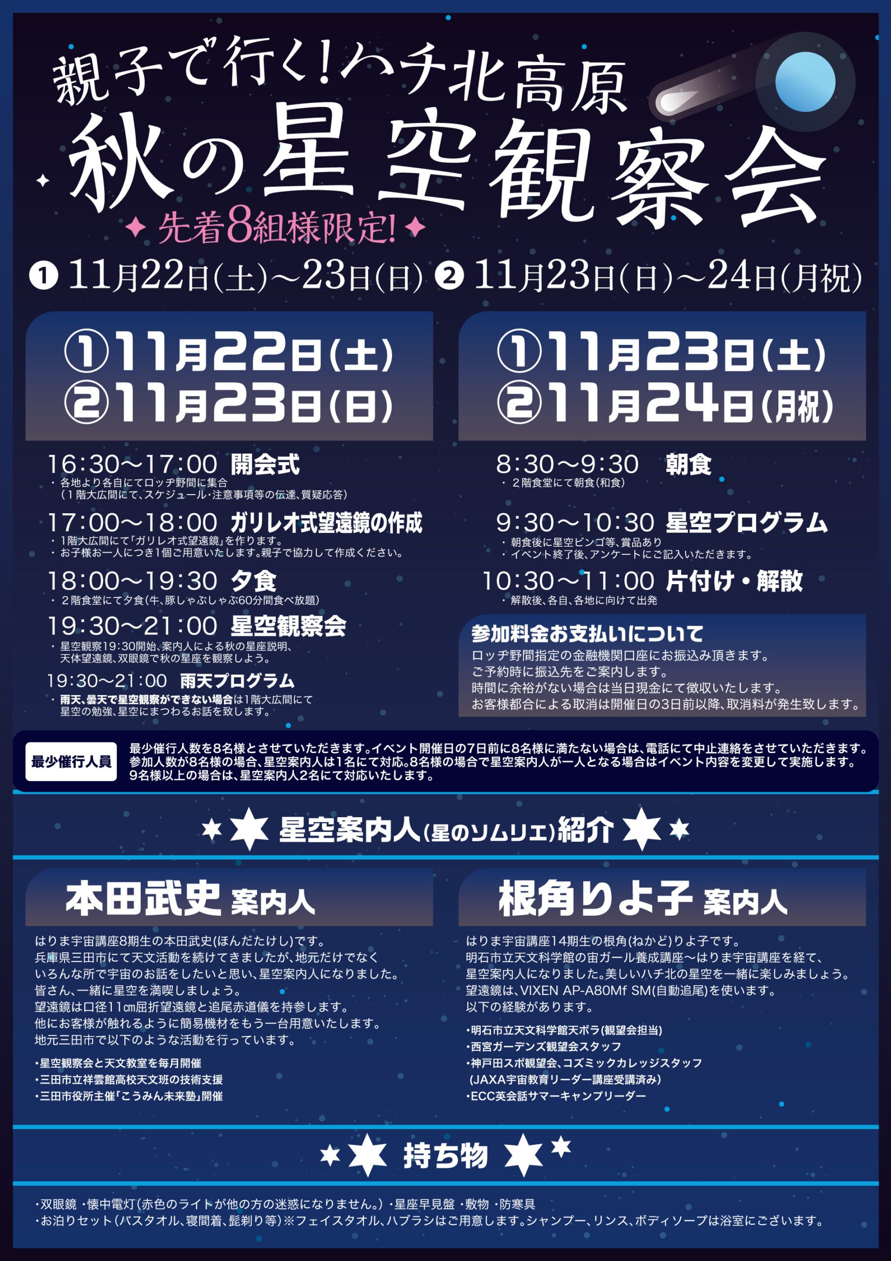 参加人数が8名様の場合、星空案内人は1名にて対応、9名様以上の場合は、星空案内人2名にて対応いたします。